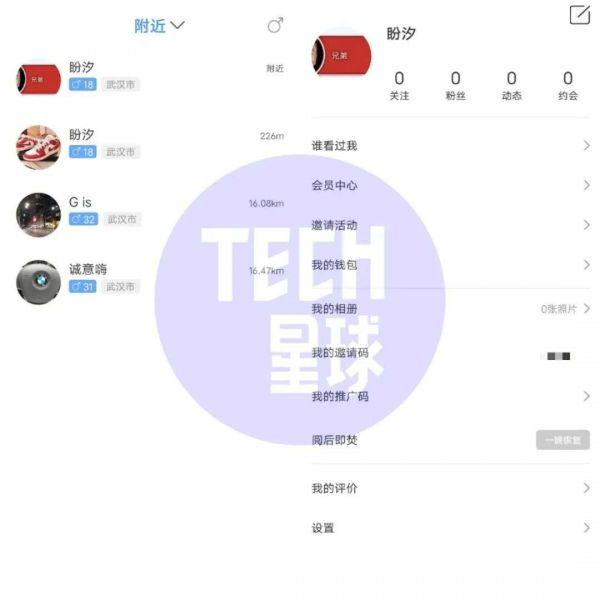 发现界面内有附近功能,可以显示男性或者女性用户的距离,还可以用图文和视频的方式展示信息,方便用户确定TA人信息后,进行线下约会。个人中心含基础的关注数、粉丝数、动态数和约会数。其中,还包含有阅后即焚的功能,用来保护用户隐私。