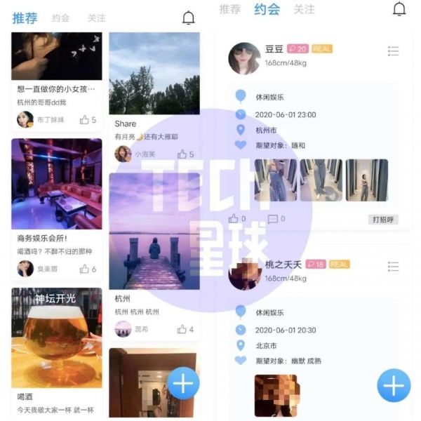 最核心的社区板块中,盼汐又细分了推荐、约会和关注三个模块。