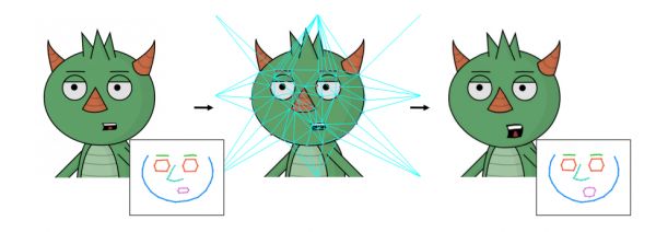 对于矢量化的图像,团队采取基于德劳内三角剖分(Delaunay triangulation)的换脸方法,在预测面部运动特征点后,给出一个二维动态图像。