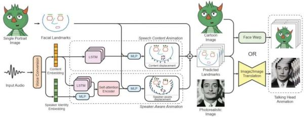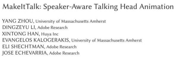 UMass和Adobe研究院已经找到让二维和3D图片开口说话的方法,那就是利用MakeltTalk通过分离影像和音频之间的关系数据集,分别根据音频内容模拟嘴唇附近的肌肉运动和根据影像来和音频同步,从而创建一种直接映射,构成人物的说话神态和动作。