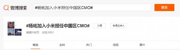 今日下午,微博上有传闻称前魅族CMO(首席营销官)杨柘将加入小米担任小米中国区CMO,并已有相关微博话题。截至发稿,该话题阅读量已超过190万,讨论超过1000条。