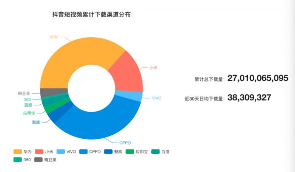 据七麦数据统计,截止到 5 月 26 日,抖音安卓版 APP 累计下载量 270.10 亿次,近 30 天每日平均下载量 3800 多万次,其中华为手机用户占比最大。