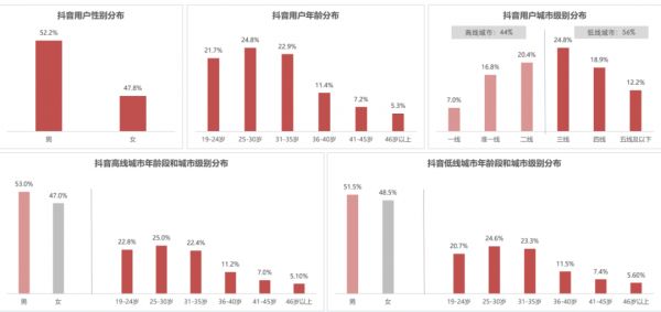 具体来看,当下抖音的用户群体以男性居多,大致占比为 52.2% ,用户年龄集中在 35 岁以下,占比接近 70% ,受众人群也下探到三四线地区。