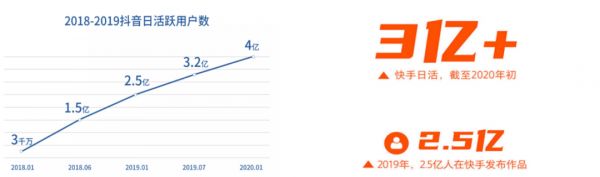 相较之下,快手的日活跃用户比抖音少一些,在 2020 年初刚刚突破 3 亿,不过有 2.5 亿人在快手发布作品,整体参与度超八成。