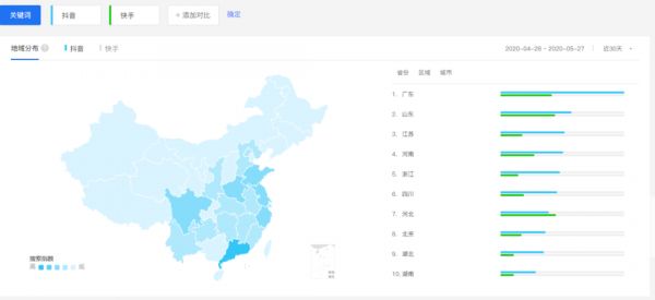 抖音与快手的用户地区分布上,还是基本呈现出南北对立的局面,其中广东、江苏、四川等地区使用抖音最为广泛;而快手则是以东北、河北等地的使用频率最多。