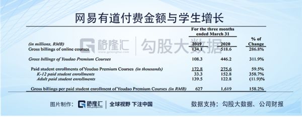 从用户规模上看,猿辅导、作业帮和学而思网校去年暑期班的人数超过百万,是第一梯队,有道、新东方在线等次之,位于第二梯队。当前有道的市值是26亿美元,其营收规模与新东方在线相仿,但其2020Q1精品课的增速超过300%。接下来的悬念就是,背靠网易的有道能否将增速保持,并跻身第一梯队。