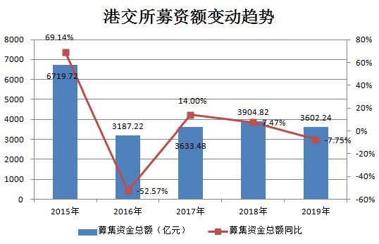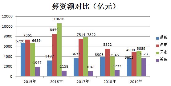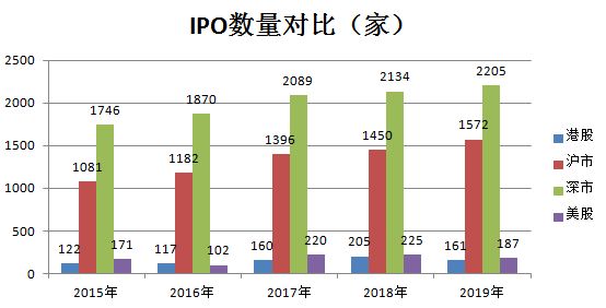 2015-2019年近5年中,港交所IPO数量在沪深两市、美股市场中有4年垫底。