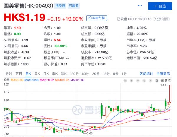 从资本市场的情况来看,国美此次的两个交易得到了正面反馈。在两个交易敲定后,6月1日,国美零售的股价收盘价为1.19港元,单天涨幅达19%。