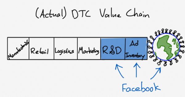 问题在于,在依赖Google和Facebook进行营销的过程中,DTC公司也放弃了其在价值链中计划的整合及其相关利润,这些都转给Facebook和Google了: