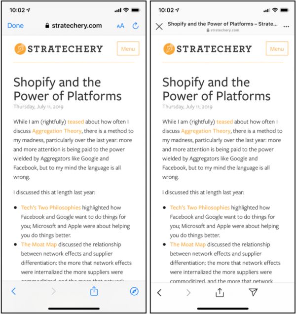 Instagram基本上就是在Instagram内部开发了自己的浏览器。它仍然使用iOS的WebKit 引擎(这是iOS的要求,这意味着Chrome浏览器也要用WebKit),但是它不受苹果的控制。按照苹果的要求这意味着没有Apple Pay,这进而又意味着在Instagram 和Facebook 里面的购买体验,要比Facebook用SFSafariViewController 或苹果围绕Apple Pay的宽松政策的效果要糟糕。
