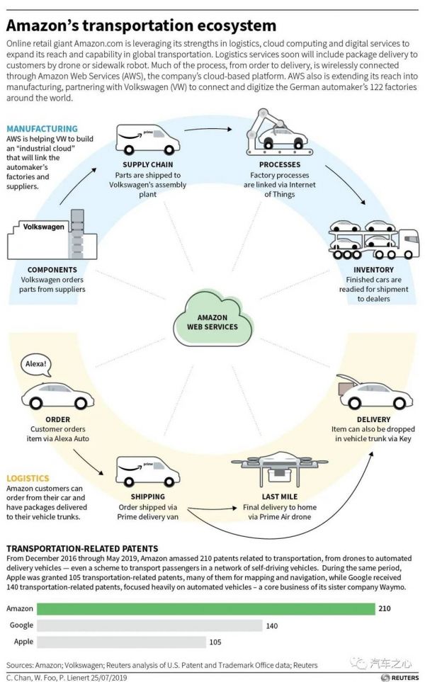 2019 年 7 月,路透社在一篇报道中对亚马逊在 2016 年 12 月至 2019 年 5 月期间获得的 5000 多项专利进行了分析,发现其中至少有 210 项专利涵盖了从无人机到自动驾驶车辆和运输等相关的主题。