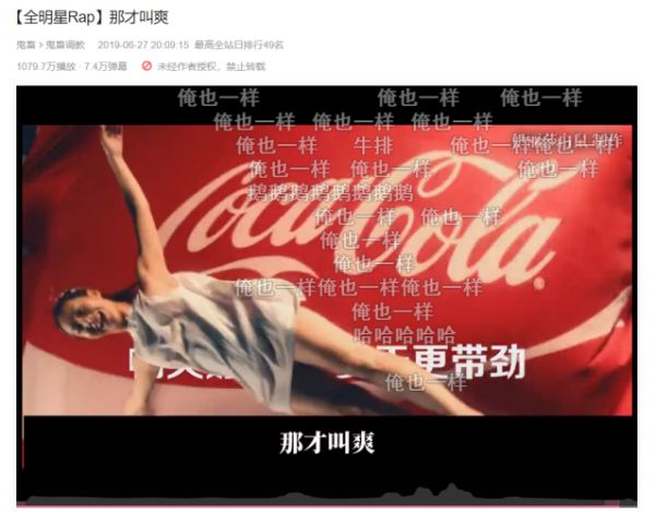 up主携手品牌,制作鬼畜视频作品的例子有,不高产但高质的百大UP主@伊丽莎白鼠,在《全明星rap:那才叫爽》的鬼畜视频中,成功植入了可口可乐的广告。这支视频获得了1079.7万次观看,传播效果甚至不亚于一个传统广告。