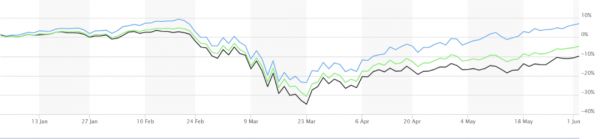 其中纳指突破了9600点关口引人瞩目。纳指在3月23日美股暴跌时触及6879.52点的年内最低点,此后一直稳步回升,今年迄今为止已经累计上涨了7.1%,目前只比2月份触及的高点9817.18点低大约2%。相比之下,道指和标普500指数分别累计下跌9.8%和4.6%。
