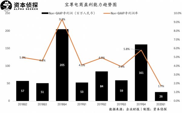 在本财季,宝尊电商在两种模式并行的情况下,继续保持了业内较高的毛利水平,毛利率达到61%。但是,净利润表现不如人意,一季度归属于宝尊股东的净利润(Non-GAAP)为2599万元,同比下降53%,净利润率为1.7%,去年同期为4.1%,净利下跌的主要原因是,疫情及经销模式GMV增长共同导致物流成本增加。