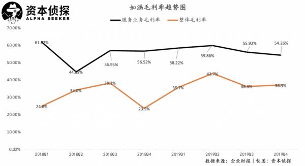 如涵代运营业务采用的是代销模式,所表现出的毛利率都在50%以上,高于代运营行业平均水平,且高于如涵公司整体毛利率。可以说,代运营模式是目前如涵想要保持盈利的主要突破点。
