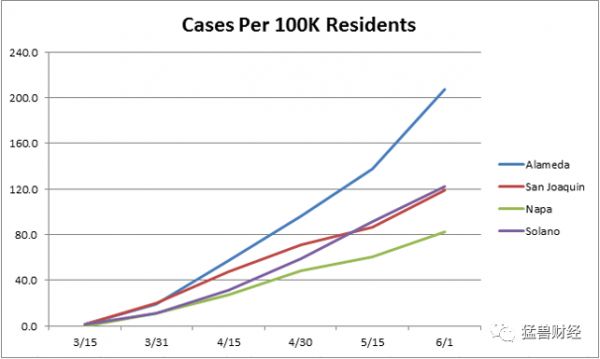 我们从第二大风险开始,因为最大的风险与弗里蒙特工厂本身有关。如果由于新冠病毒的爆发,工厂被迫再次关闭或大幅减少运营,特斯拉将发现自己处于非常可怕的境地。在之前一篇关于这个工厂的文章中,我们讨论了特斯拉关于重新开放工厂的文章,其中比较了弗里蒙特的阿拉米达县和其他一些新冠肺炎病例。正如你在下面的更新图表中所看到的,阿拉梅达县的病例数继续远高于其他三个地区。