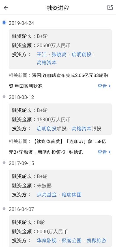 2019年4月24日,据媒体公开报道,连咖啡已完成2.06亿元B3轮融资,此轮融资由连咖啡创始人王江和张晓高、启明创投、高榕资本联合投资。本轮参投的启明创投和高榕资本同时也是连咖啡B+轮融资的主要投资方。