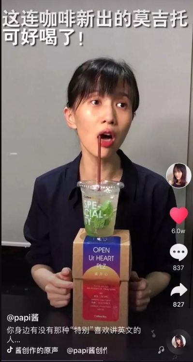 2018年4月份,连咖啡联手papi酱,在抖音平台推出第一款酒精饮品莫吉托。papi酱以吐槽喜欢讲英文的段子入手,将新品“莫吉托”贯穿其中,获赞超过26万,而这也是papi酱在抖音平台的首个广告。
