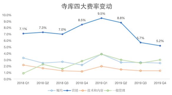 2019年Q4,寺库运营总支出同比下降7.5%至2.46亿元,在过去8个季度中最为“节制”。其中,寺库大幅削减了营销支出,该项费用自上市以来首显负增长,同比下滑30.9%至1.06亿元。