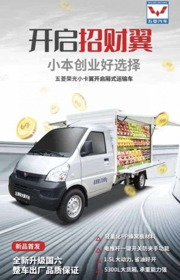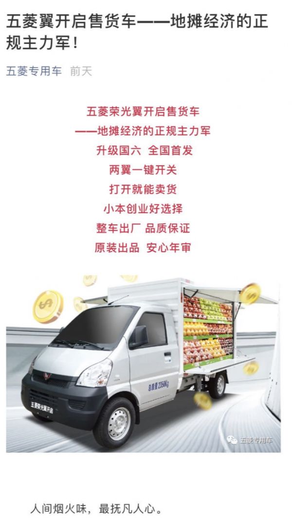6月3日,微信公众号“五菱专用车”发了一篇题为《五菱翼开启货车——地摊经济的正规主力军》的“雄文”,大喇喇摆出“五菱荣光翼开启售货车”的功能和优点:打开就能卖货,小本创业好选择,整车出厂品质保证,原装出品,安心年审。翻译成口头语就是:我五菱就是最最最好的地摊货车。