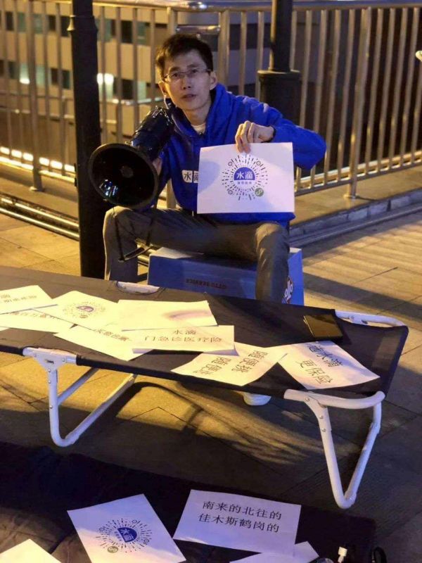水滴筹也效仿了这个套路。水滴筹CEO沈鹏亲自支起了小摊,为自家产品打Call,衣服上都印好了水滴筹的品牌名,准备得有一些诚意。
