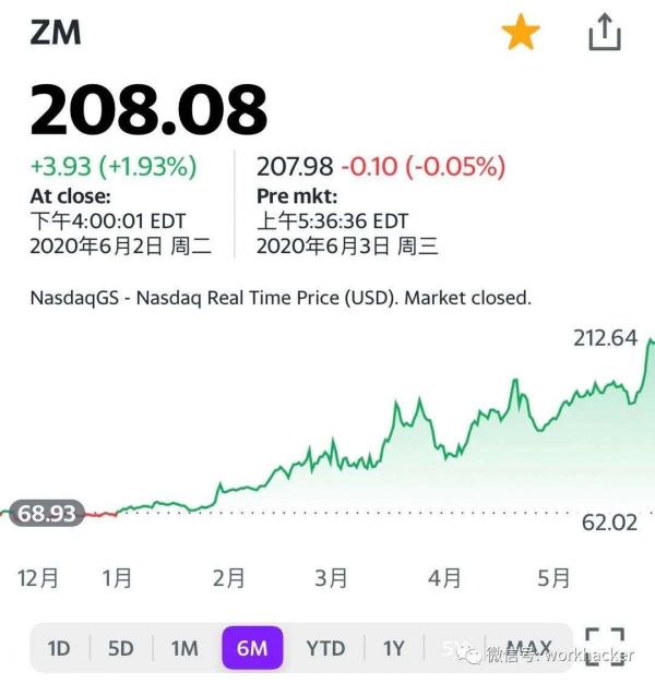 截止6月2日美股收盘,zoom股价为208.8美元,总市值586.69亿美元。截至6月1日,zoom今年股价累计涨超190%。