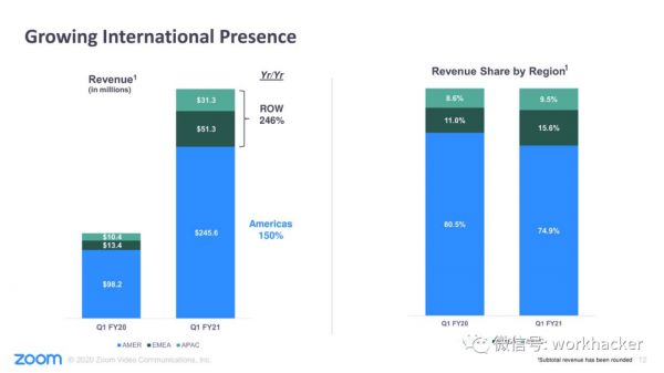 在本季度,Zoom的收入增长中,新客户订阅贡献了大约71%的增长,而老客户的订阅则贡献了其他大约29%的增长。而且这个比例在各个行业、地域和客户群体中基本都是如此。也就是说新客和老客的贡献营收比例大约为7:3。