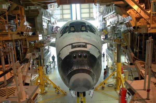 完成一次飞行后,在厂房中进行维护的航天飞机轨道器(图片来源:NASA)