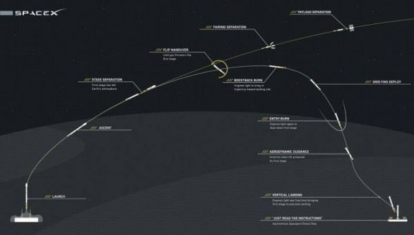 SpaceX第一级火箭回收过程,期间火箭发动机要多次点火,因而要预留燃料(图片来源:SpaceX)