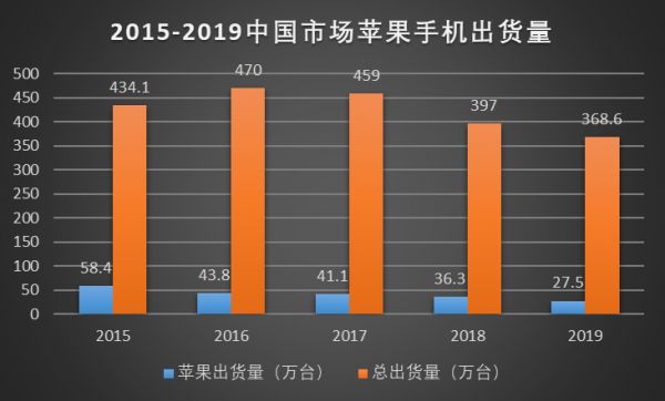 而从2015年开始,苹果在中国的出货量与份额占比就已经在逐渐递减了。2019年的苹果与鼎盛时期的2015年相比,在国内的出货量下降了53%,份额腰斩了一半。