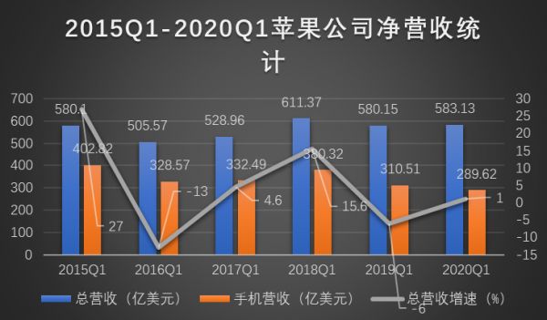 而这种影响也直接体现在了苹果财报的净营收数据上。横向比较2015-2020年第一季度的净营收,虽然苹果公司的净营收趋势大体平稳向好,但是苹果手机业务在净营收中的占比已经从15年的69.4%下降到了20年的49.7%,收入金额下降了113.2亿美元。