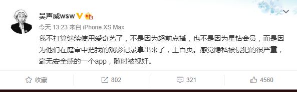 4日,因超前点播起诉爱奇艺的用户吴某发微博称,“不打算继续使用爱奇艺了,不是因为超前点播,也不是因为星钻会员,而是因为他们在庭审中把我的观影记录拿出来了,上百页,感觉隐私被侵犯的很严重。”