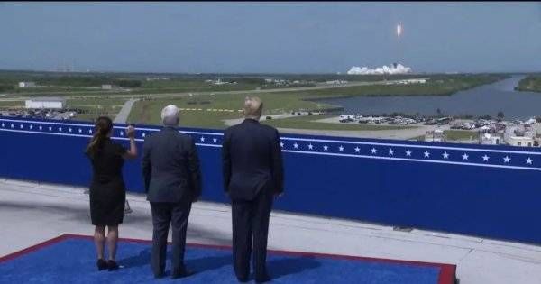 美国总统特朗普和副总统彭斯在远处观看载人版龙飞船发射升空。