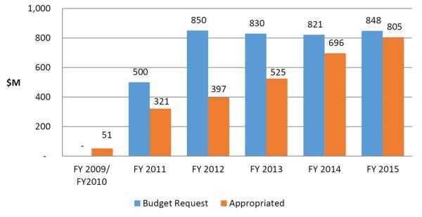 Commercial Crew项目截至2015年的申请资金与已批准资金,来自维基百科