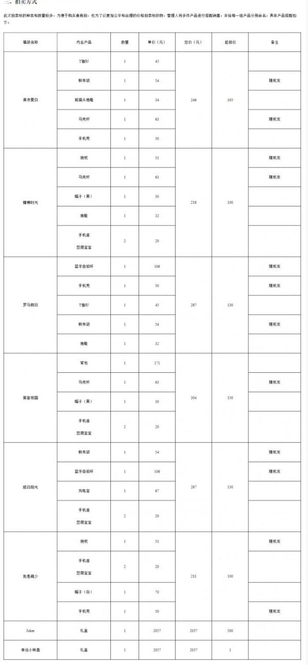 拍卖公告称,因拍卖标的种类和数量较多,为便于购买者竞拍,也为了以更加公平和合理的价格拍卖标的物,管理人将多件产品进行搭配销售,并给多件产品组合成为“福袋”并各自命名。拍品包括帽子、拖鞋、帆布包、手机壳、充电宝等23种物品。
