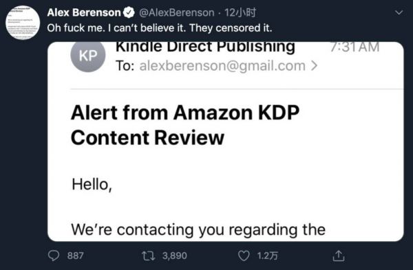 Alex Berenson收到亚马逊的拒绝邮件后当即发了推特叫屈。“他们竟然把我的书给审核了!”