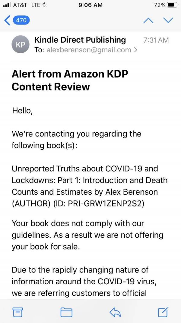 发出这个言论的起因是,亚马逊的 Kindle 拒绝出版作家 Alex Berenson 的一本有关疫情的书,书名叫做《未报道的关于新冠病肺炎和封禁的真相》(Unreported Truths about COVID-19 and Lockdowns),听起来就很阴谋论的感觉...