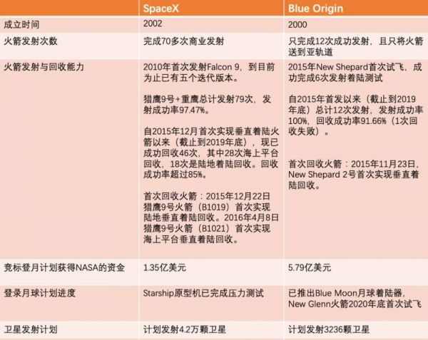 SpaceX和蓝色起源成立于同一时期。但由于蓝色起源研发进度缓慢,运营生产思路大体继承了传统航天的旧态,从技术和商业运用的角度都和SpaceX相差了一大截。