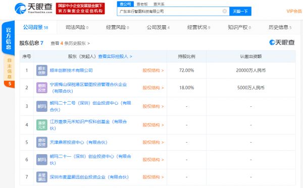 广东丰行智图科技有限公司成立于2018年9月,法定代表人为丰行智图CEO周训飞,公司经营范围包括数字地图设计、开发、地理遥感信息服务,研发、生产计算机软件;计算机系统集成等。天眼查数据显示,该公司工商披露的股东信息中,顺丰创新技术有限公司为该公司第一大股东,持股比例为72%。