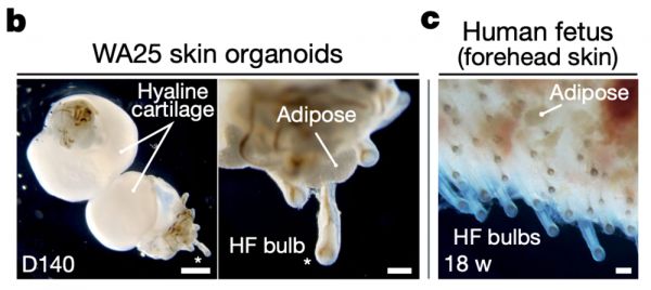 70多天后,这些细胞逐渐长成了一个个球体,每个球体中大概孕育了近50个毛囊。累计4~5个月的培育期后,团队终于得到了具备明显表皮层、真皮层,且具有毛囊、皮脂腺、神经回路的“人造皮肤”,论文中称其为类器官(organoids)。
