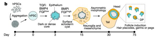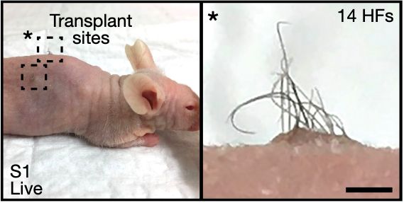 最近,Nature上发表的一篇论文就展示了用干细胞制造包含毛囊、接近完全的人类皮肤的可能性。经过4~5个月培养后,这些“人造皮肤”被移植到小鼠背上,不仅与小鼠皮肤融合,其中55%还能继续生长,并长出了2~5mm长度的人类毛发。