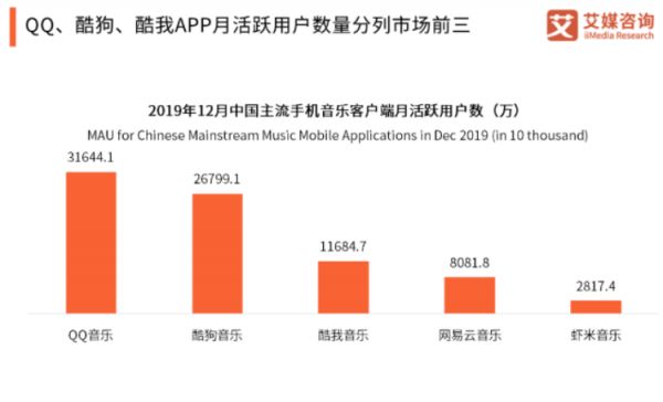 根据艾瑞咨询发布的《2019-2020中国手机音乐客户端市场研究报告》显示,QQ、酷狗、酷我三个音乐平台位列三甲,网易云音乐位列第四有8000+的用户月活,再往后的虾米音乐就更低,只有2800万+。