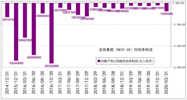 2020年Q1,百世集团归属于母公司股东的净利润亏损7.43亿元人民币,较2019Q1的亏损2.31亿元,增加亏损5.12亿元,下降幅度高达222%!