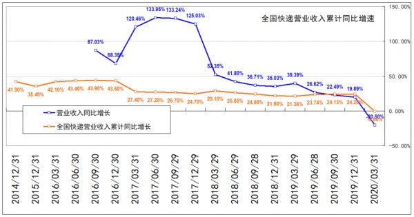 根据国家邮政局公布的数据,2020年Q1,受新冠疫情影响,国内快递行业业务量累计平均增速为3.2%、收入累计平均增速为-0.60%,较往年大幅收窄。