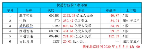 顺丰控股(002353)以2012.04亿元人民币总市值排名榜首,百世集团(BEST.US)位居“老六”。