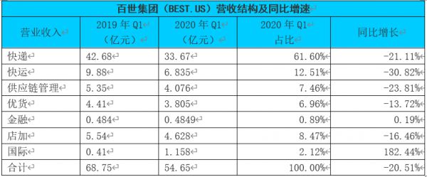 2020年Q1,疫情期间,百世的营业收入为54.65亿元,同比减少20.5%。