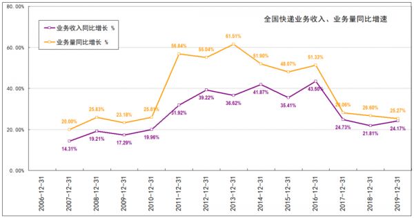 国家邮政局公布的数据,2006—2019年,全国快递业务量同比增速从20.00%,上涨至2013年的最高值61.51%后,快速回落,至2019年底,为25.27%。
