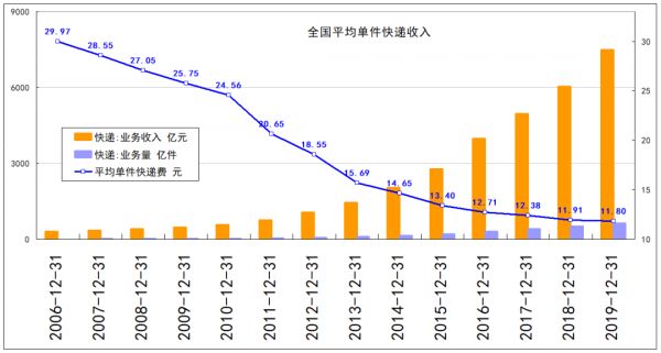 我们用全国快递业务收入除以业务量,可得出全国平均单件快递费曲线。从2006年的29.97元,逐步下降至2018年底的11.91元、2019年底的11.80元。由下图可知,近几年的降价幅度大幅收窄,2018-2019年仅降价0.11元。