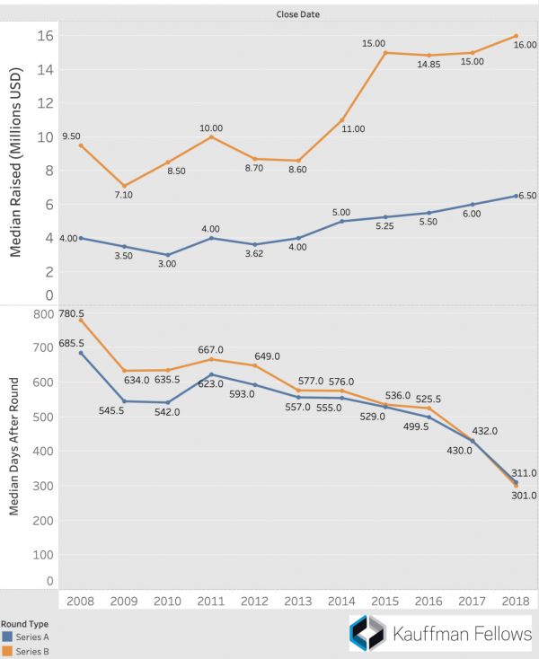 但仔细想想,这确实是一种资本助推下的特权。如果没有风险投资的支持,这样的快速扩张是不可能的。以下面这张来自考夫曼研究中心的图表为例。自2008年以来,A轮和B轮的风险投资分别增长了68%和62%,而与此同时,完成下一轮投资所需的天数也减少了一半。这意味着创业公司在A轮和B轮的之间,所消耗的现金是十年前的3倍。这些额外的现金,并没有被用来让企业走得更远。