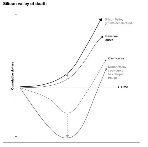 骆驼创业公司通过采取更平衡的增长方式,避开了死亡谷。下图,简明扼要地解释了这种动态。